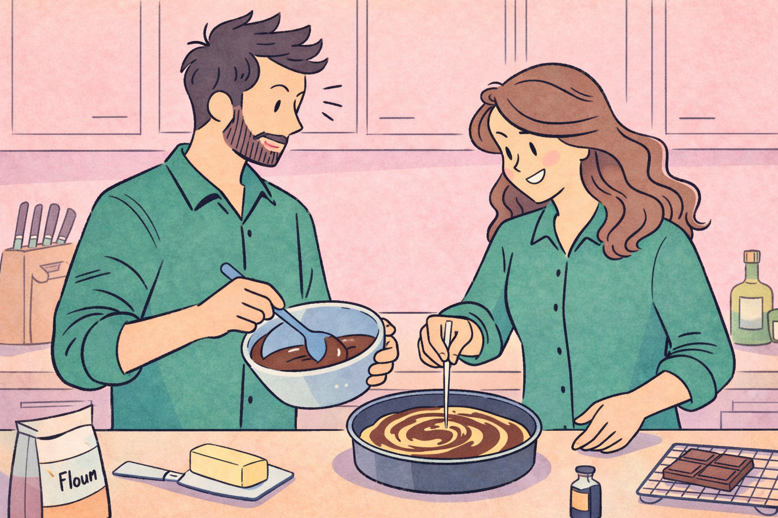 B: Então misture e faça um bolo mesclado de chocolate.